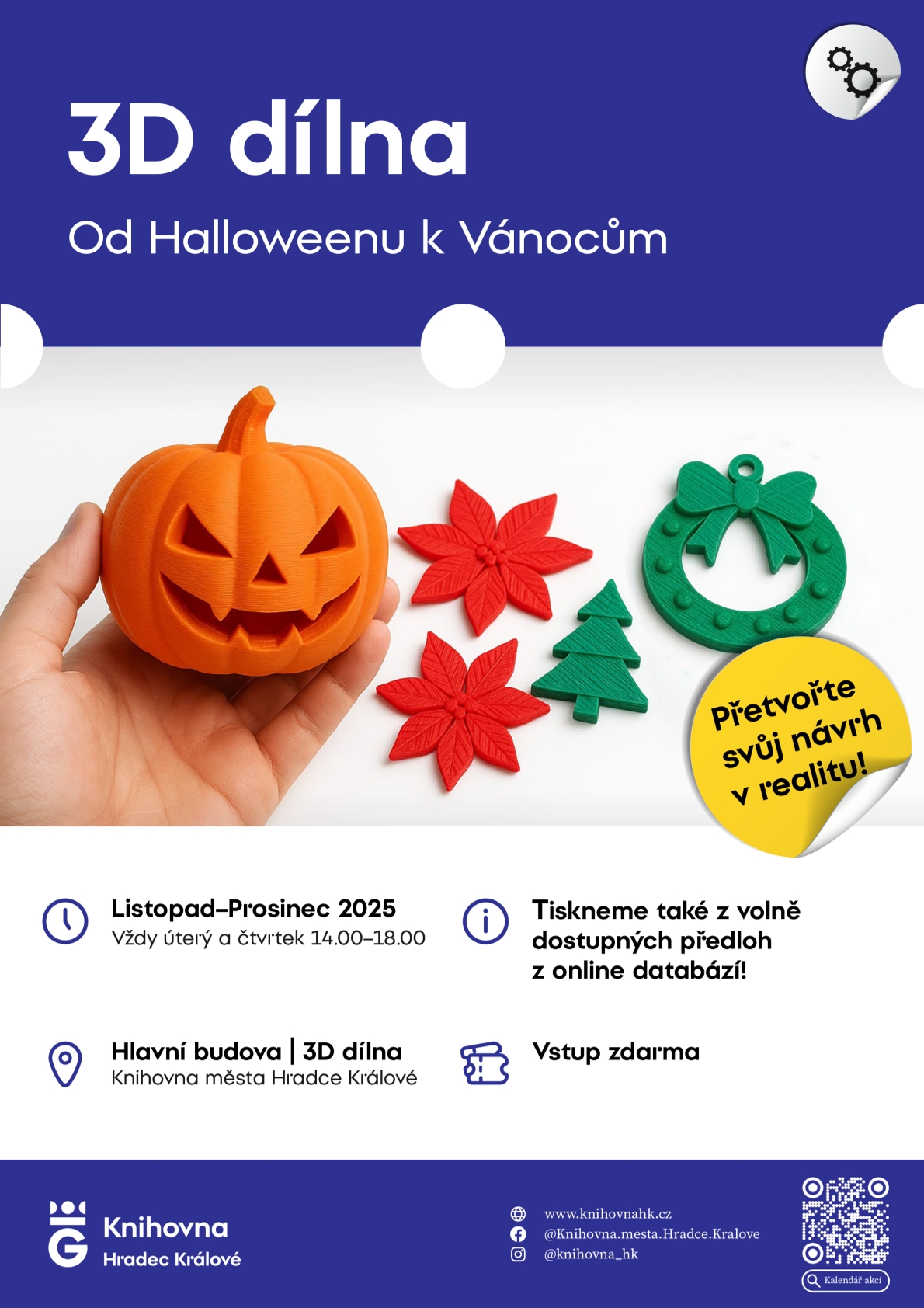 Vyrobte si originální dekorace, které zkrášlí váš domov nebo potěší jako milý dárek. Nebo se jen přijďte seznámit s 3D modelováním a tiskem samotným. 3D dílna je otevřená každé úterý a čtvrtek v čase 14:00–18:00.