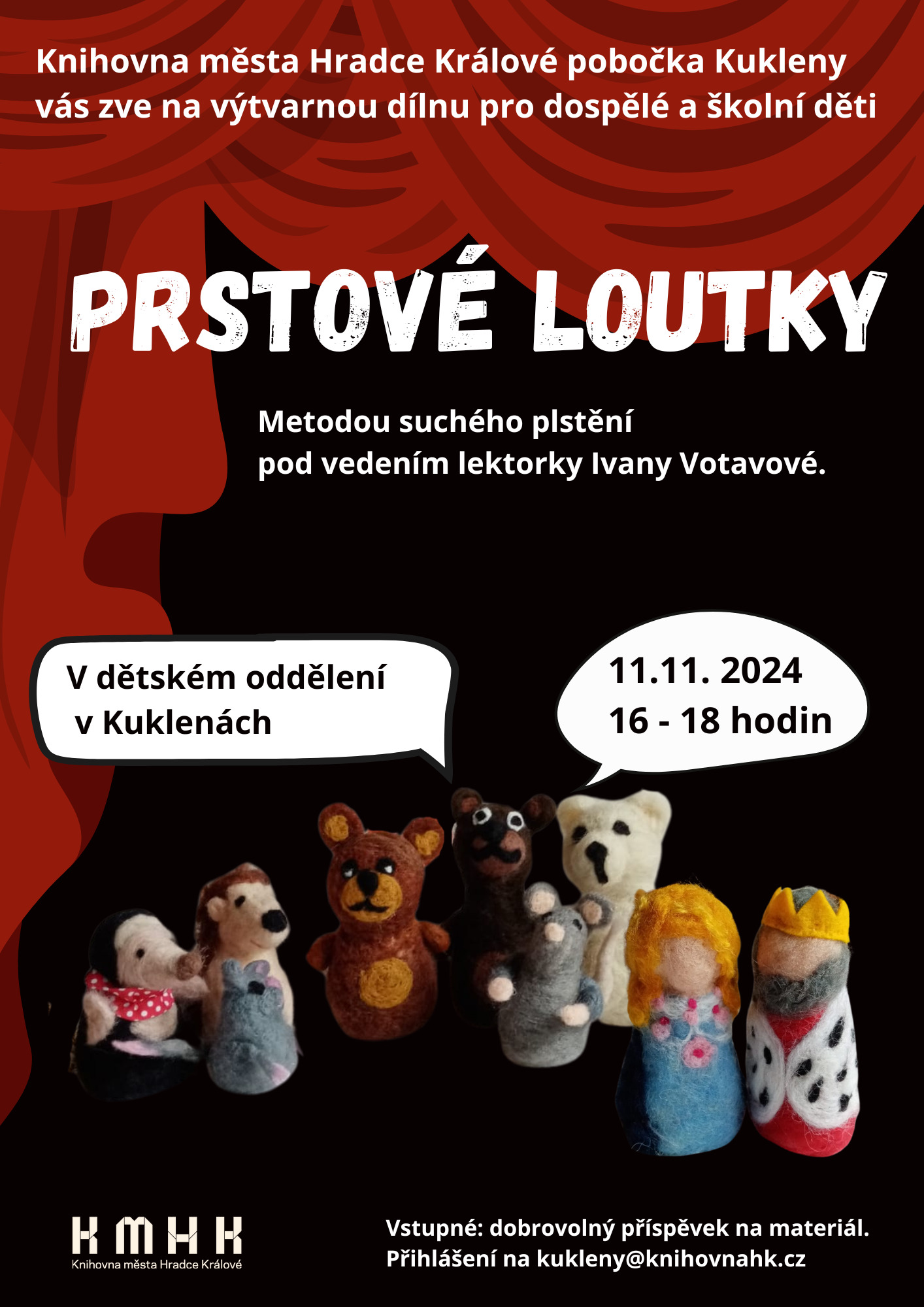 Chcete si vytvořit své vlastní prstové loutky? Tak přijďte k nám na výtvarnou dílnu! Dílnu povede lektorka Ivana Votavová, která má bohaté zkušenosti s metodou suchého plstění. Vstupné je dobrovolný příspěvek na materiál.
