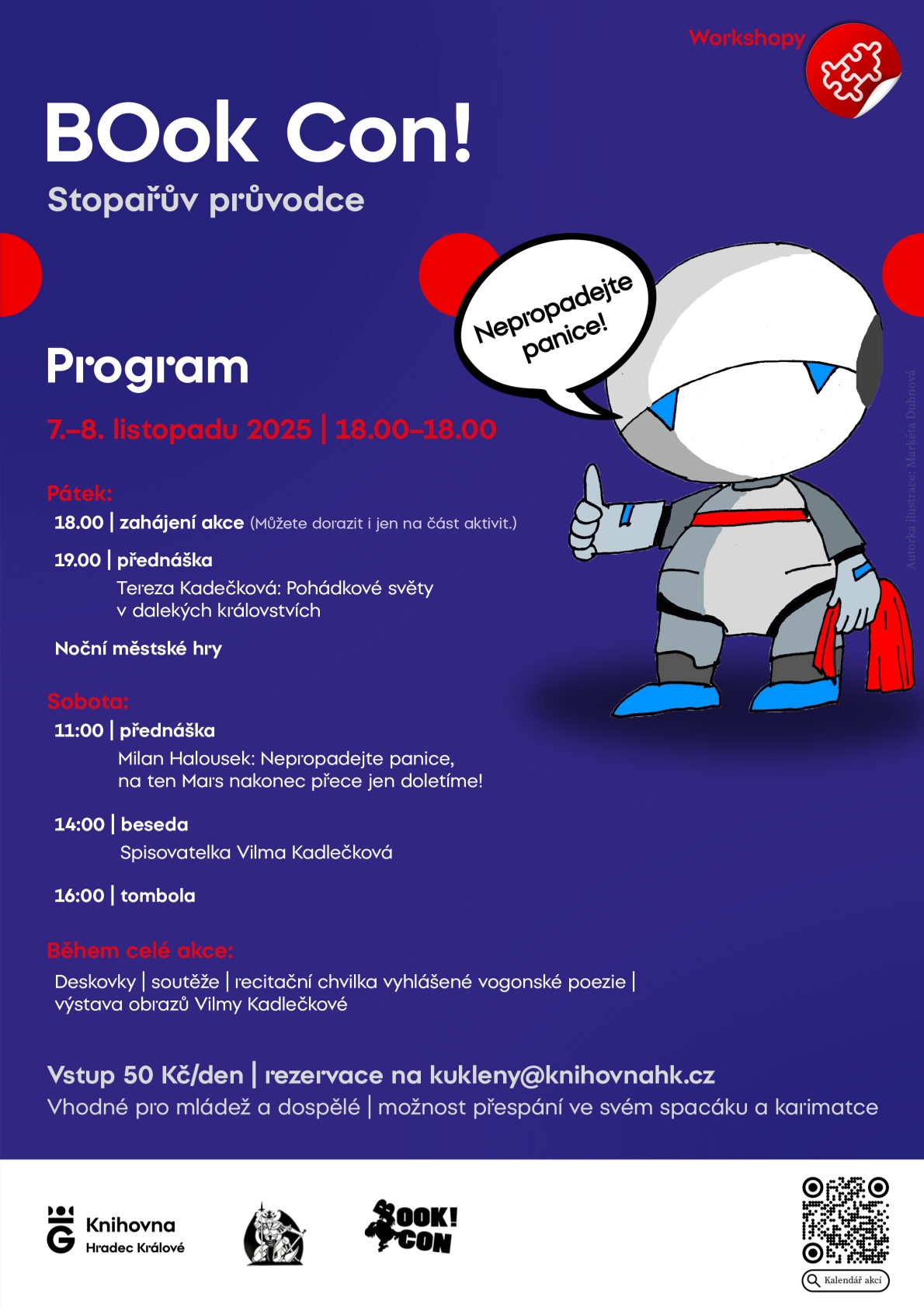 BOoK Con! je konečně tady! Začínáme v pátek v 18.00 a končíme v sobotu v 18.00. Čeká vás 24 hodin ve světě fantasy, sci-fi, komiksu a deskovek. Akce je pro dospělé a mládež, mladší děti v doprovodu rodičů. Rezervace na kukleny@knihovnahk. Vstupné 50 Kč/den.