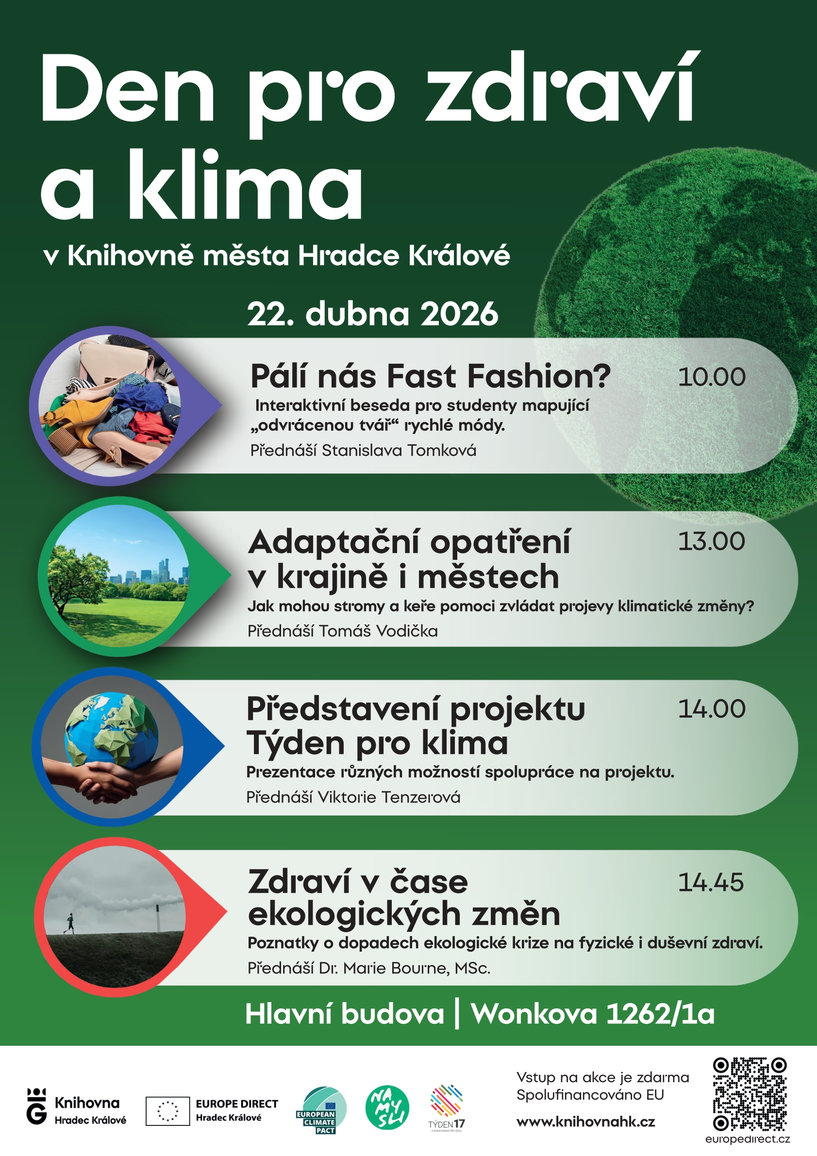 Den pro zdraví a klima, který pořádá informační centrum Europe Direct Hradec Králové v prostorách Knihovna města Hradce Králové, nabídne sérii přednášek zaměřených na souvislosti mezi změnou klimatu a lidským zdravím. Odborníci během programu představí, jak klimatická změna ovlivňuje naše prostředí, kvalitu ovzduší, životní styl i celkové zdraví společnosti. Návštěvníci se dozvědí více o dopadech klimatických změn na každodenní život, možnostech prevence i o tom, jak mohou jednotlivci i města přispět k udržitelnější a zdravější budoucnosti.