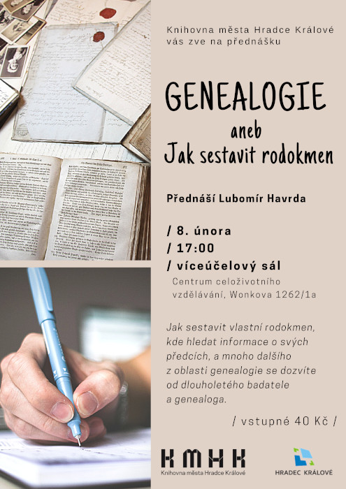 Jak sestavit vlastní rodokmen, kde hledat informace o svých předcích, a mnoho dalšího z oblasti genealogie se dozvíte od dlouholetého badatele a genealoga Lubomíra Havrdy. Pořádáno S PODPOROU MĚSTA HRADEC KRÁLOVÉ. Vstupné 40 Kč.