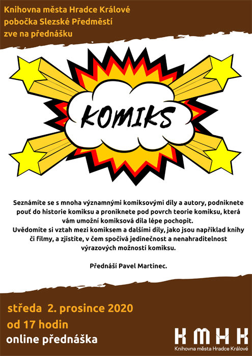 Seznámíte se s mnoha významnými komiksovými díly a autory, podniknete pouť do historie těchto obrazových knih a proniknete pod povrch teorie komiksu, která vám umožní tato díla lépe pochopit. Uvědomíte si jejich vztah s dalšími díly, jako jsou například knihy či filmy, a zjistíte, v čem spočívá jedinečnost a nenahraditelnost výrazových možností komiksu. S Pavlem Martincem v online prostoru!* Vstup volný.