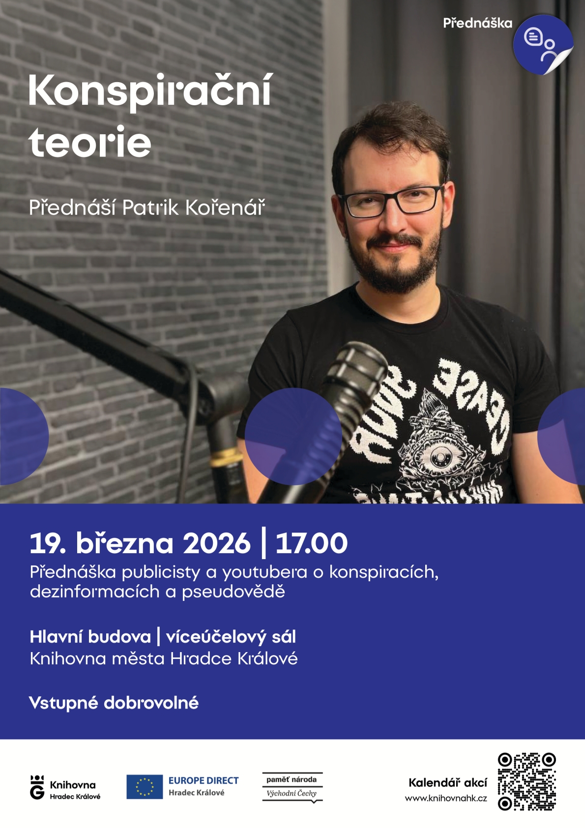 Konspiračních teorií najdeme nejen na internetu obrovské množství. Některé zapadnou, jiné hýbou mediálním světem a ovlivňují názory milionů lidí. Jak můžeme poznat nesmysly od skutečných spiknutí a zorientovat se v moderní informační džungli? To se dozvíte na přednášce publicisty a youtubera Patrika Kořenáře, který se již osm let věnuje hloubkovým rozborům konspiračních teorií, dezinformací a pseudovědy.