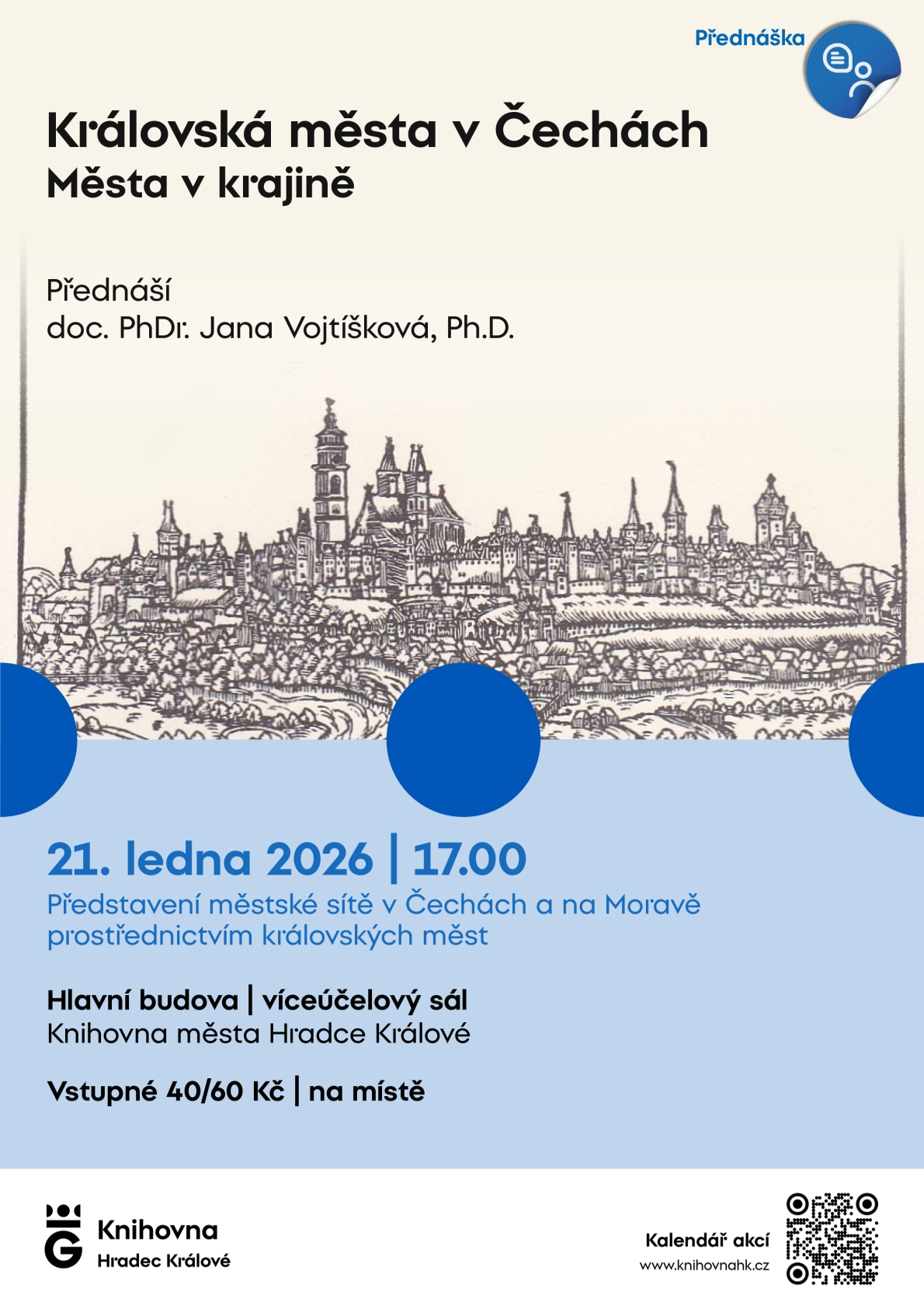 Přednáška představí vznik a vývoj městské sítě v Čechách a na Moravě od 13. století až po raný novověk. Na příkladu vybraných královských měst zjistíte, proč některá města dlouhodobě prosperovala, jiná stagnovala či zaostávala. Výklad doplní také proměny těchto měst v 19. století, kdy jejich vývoj zásadně ovlivnila industrializace a urbanizace. Přednáší doc. PhDr. Jana Vojtíšková, Ph.D. Vstupné 40/60 Kč.