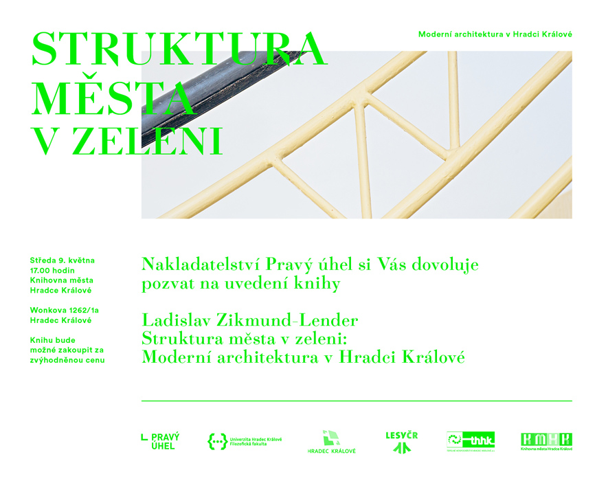 Nová kniha Ladislava Zikmunda-Lendera Struktura města v zeleni: Moderní architektura v Hradci Králové představuje ve dvaceti kapitolách nejvýznamnější tvůrce, stavby a architektonické tendence 20. století. Kniha obsahuje přes 300 vyobrazení, současných a historických fotografií, plánů a kreseb, mapu objektů, rejstřík a rozsáhlé anglické resumé. Kniha bude k dostání za akční cenu. Vstup volný.
