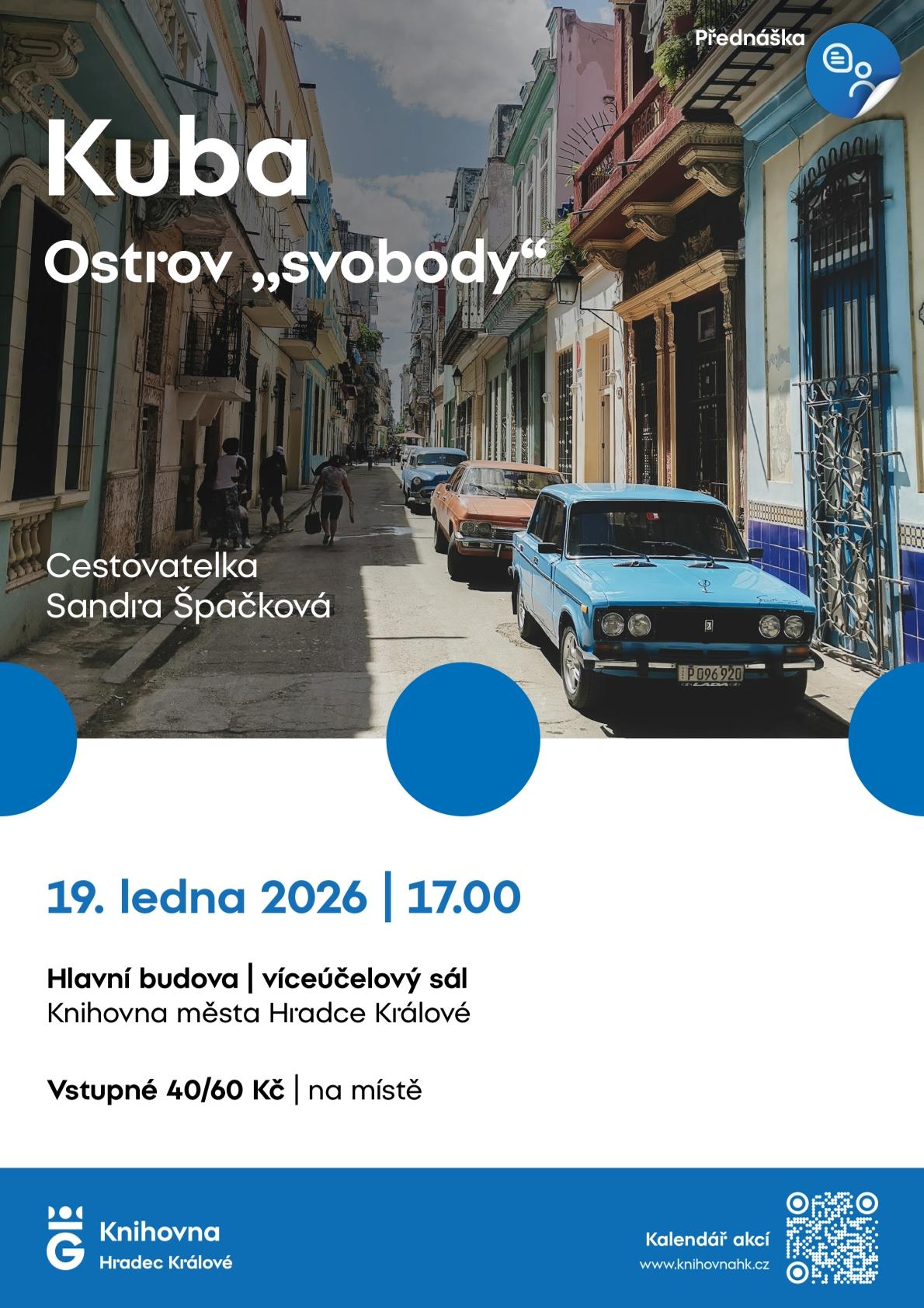 Z tabákových plantáží na západě ostrova až na rebelský jihovýchod do Santiaga de Cuba. Tato země, která se stala jakýmsi skanzenem komunistického režimu, nabízí tanec, architekturu, hudbu, pláže, přírodu i Hemingwayovu stopu. Přednáší cestovatelka Sandra Špačková. Vstupné 40/60 Kč.