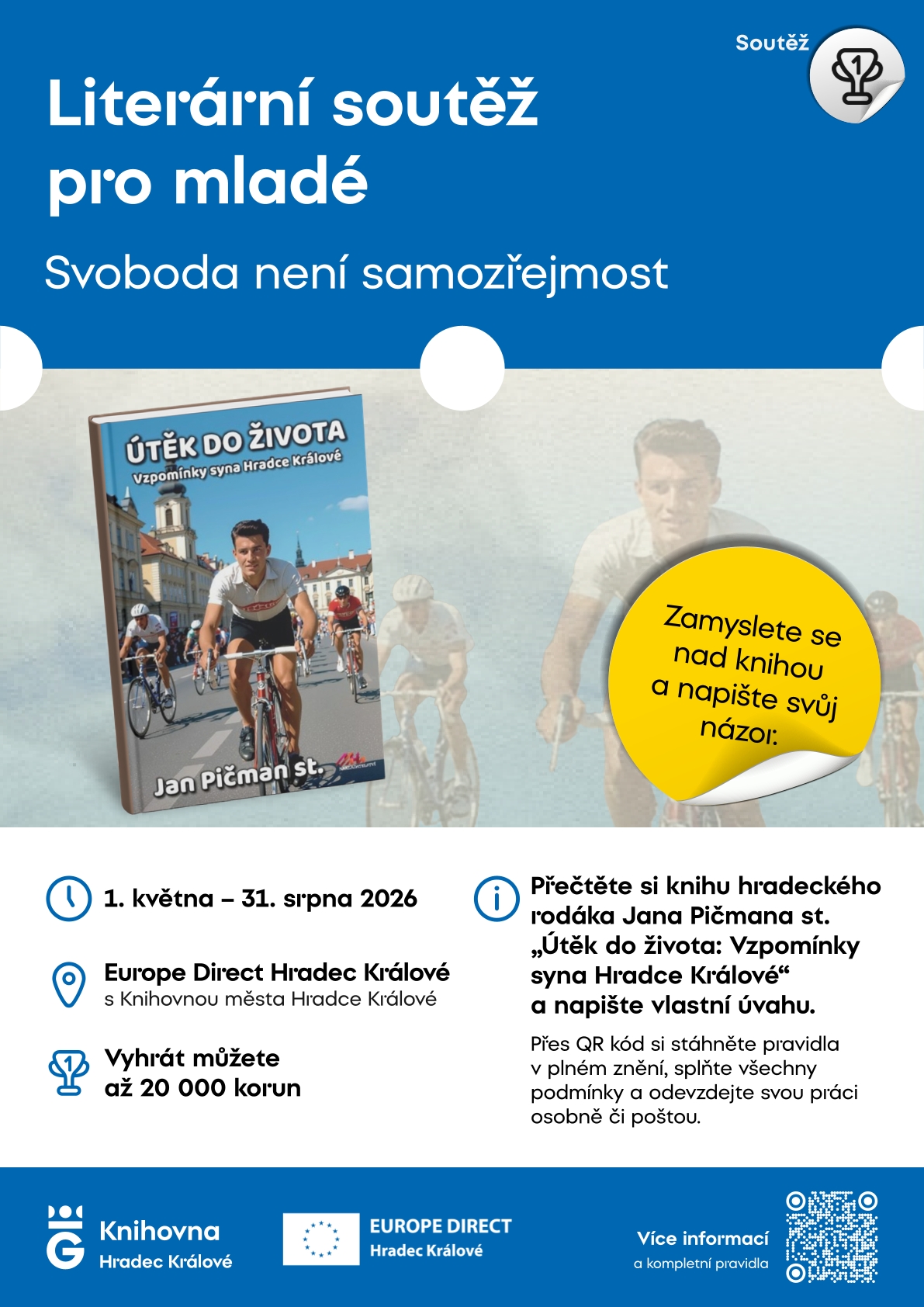Literární soutěž pro mladé inspirovaná knihou Útěk do života: Vzpomínky syna Hradce Králové od Jana Pičmana st. Účastníci mohou soutěžit o finanční odměny v hodnotě 35 000 Kč.