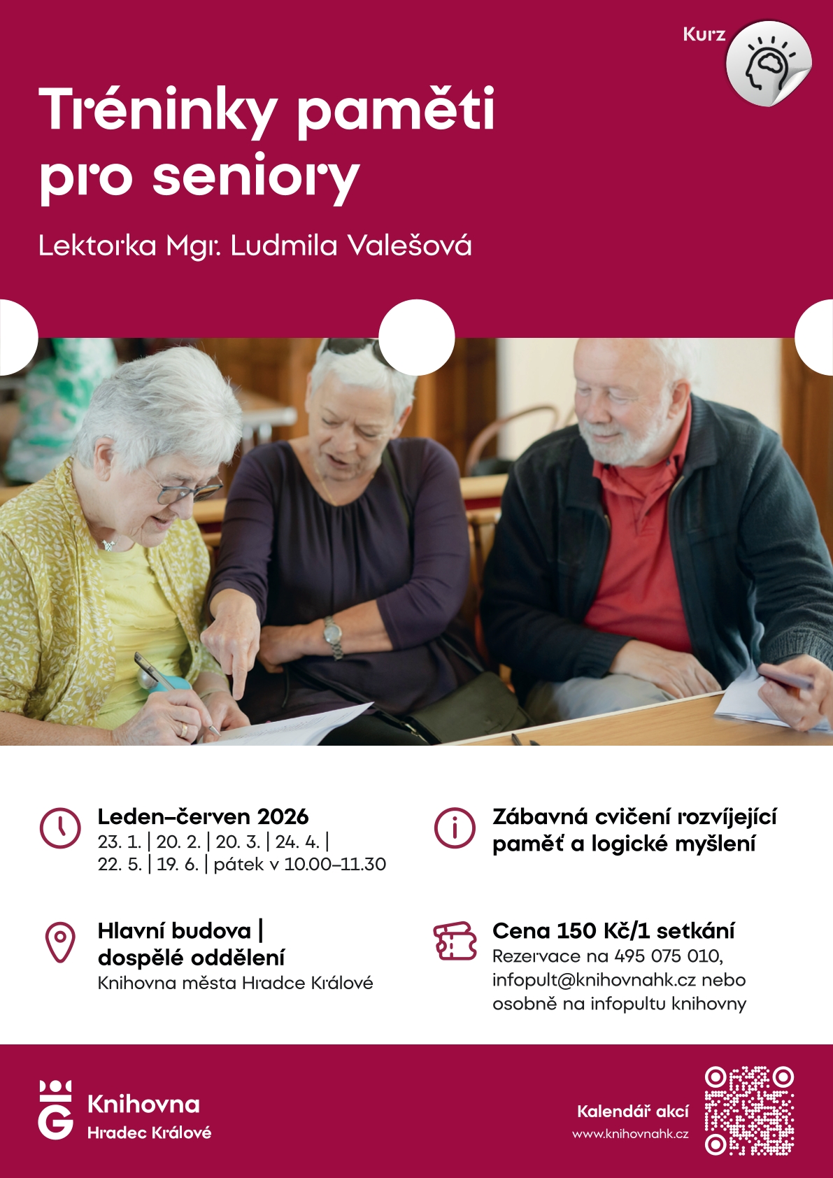Zveme všechny, kteří si chtějí zachovat duševní kondici a aktivovat mozek na optimální výkonnost. Lektorkou je Mgr. Ludmila Valešová. Rezervace na 495 075 010, infopult@knihovnahk.cz nebo osobně na infopultu knihovny.