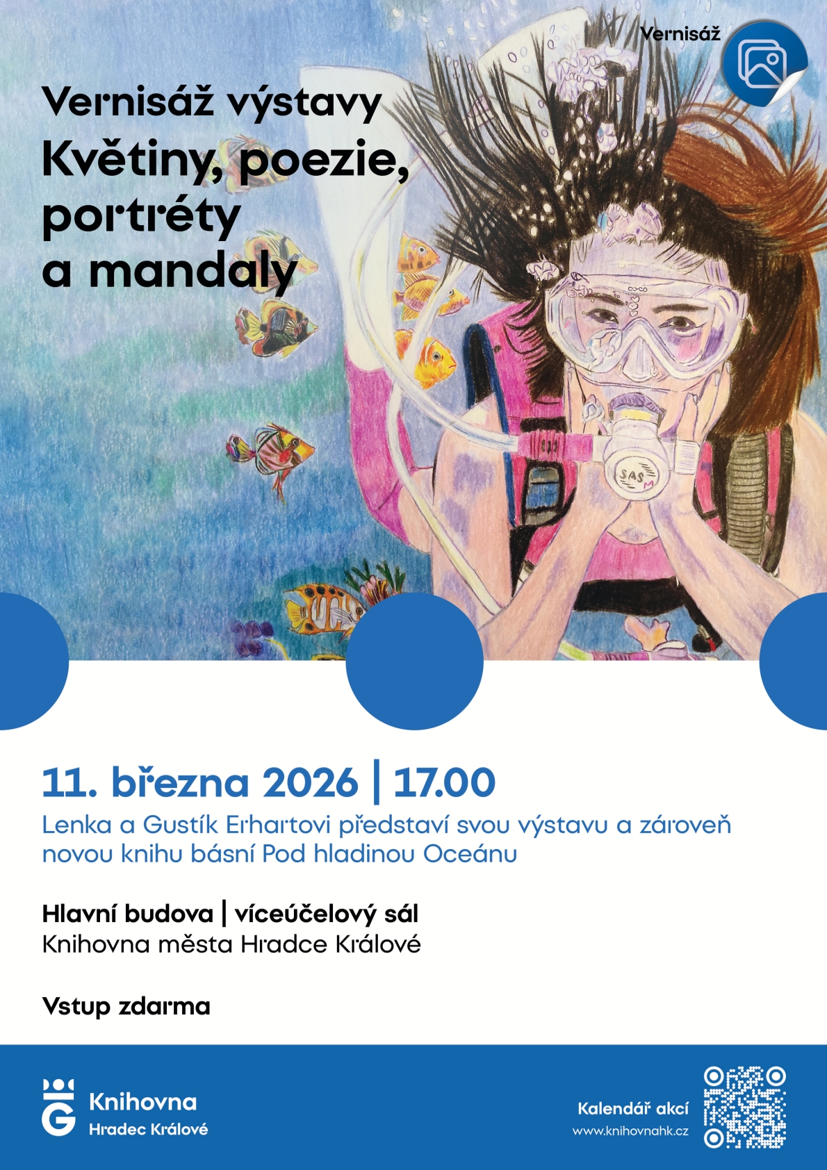 Zveme vás na vernisáž výstavy Lenky a Gustíka Erhartových. Součástí bude autorské čtení Gustíka Erharta jeho nové knihy básní Pod hladinou Oceánu.